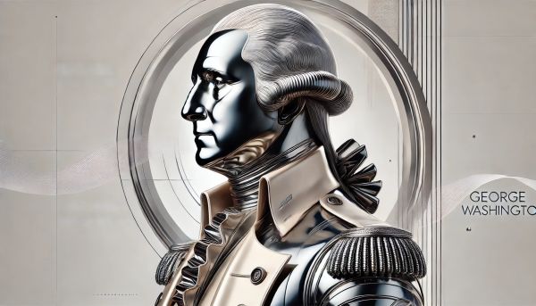 This striking digital artwork reimagines George Washington with a contemporary and futuristic twist. The former U.S. president is depicted with sleek, metallic textures that give him a robotic appearance, contrasting sharply with his historical context. The background features soft, circular patterns that highlight the central figure, emphasizing his enduring significance in American history. This piece blends traditional portraiture with modern design elements, creating a visually captivating interpretation that bridges past and future.
