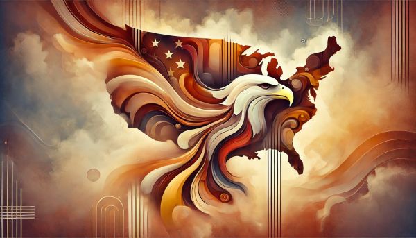 This striking artwork transforms the map of the USA into the majestic form of an eagle, using a warm autumnal color palette. The design masterfully blends abstract elements with realistic details, capturing the essence of freedom and strength symbolized by the eagle. The use of gradients and subtle geometric shapes in the background adds a modern touch to this patriotic piece. This print is perfect for those who appreciate unique interpretations of national symbols and seek to incorporate symbolic and artistic decor in their spaces.