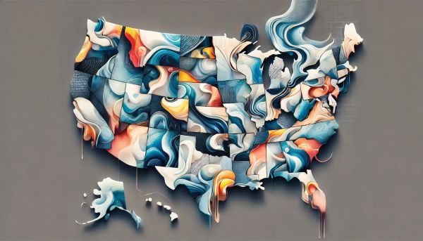 This striking piece of wall decor combines abstract cubism with a hint of surrealism to form a unique and contemporary representation of the United States map. Constructed from a series of fragmented, geometric shapes, each state is distinct yet contributes to a harmonious overall aesthetic. The color palette is a soothing mix of cool and warm tones, making it an ideal choice for modern interiors that seek a touch of subtle sophistication and artistic flair. This artwork transforms familiar geographical outlines into a visually compelling narrative, perfect for both home and office settings.
