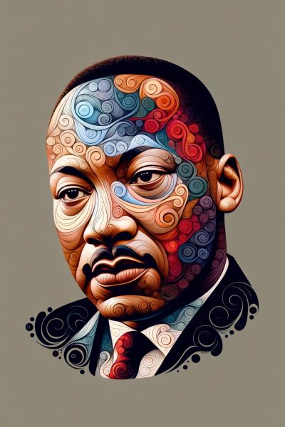 This imaginative portrait of Martin Luther King Jr., creatively rendered in a DALL-E-style, merges abstract and surrealistic elements into a striking visual tribute. The artwork captures King's thoughtful expression amidst a tapestry of vibrant, swirling patterns and colors that suggest depth and complexity. Each curve and swirl on his face are meticulously designed to evoke King’s profound impact and legacy. A unique blend of traditional portraiture with modern digital art techniques, this piece invites viewers to reflect on the enduring symbols of peace, freedom, and equality.