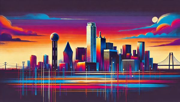 Neon Glow and Dusk Hues: Abstract Dallas Skyline Artwork