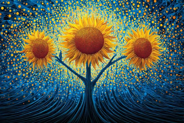 Bathed in a pool of vivid blues and radiant yellows, this reimagined version of Van Gogh's iconic Sunflowers comes alive beneath swirling celestial patterns that evoke a dreamlike state. The artist has intricately woven a tapestry of curved lines and dots, crafting a stylized universe where three sunflowers stand boldly, their golden faces turned slightly towards the sky. Each petal is accentuated with a detailed, almost tactile texture that invites viewers to feel the energy and emotion poured into this homage. This modern reinterpretation applauds Van Gogh's vision, showcasing the timeless appeal of his work while providing a fresh, contemporary perspective. The typical emotional intensity of Van Gogh’s work is captured here, melding painstaking detail with a profound admirative passion, appealing to lovers of both classic art and modern design. *** About the [Reimagined Sunflowers] ***: Inspired by Vincent van Gogh's original Sunflowers, this piece pays homage to the master's unique style, while infusing elements from contemporary artists like Ross Lovegrove and Stefan Sagmeister, known for their distinct use of form and pattern. Van Gogh originally created his Sunflower series in the late 1880s, in Arles, France, aiming to represent themes of gratitude and warm welcome. Each sunflower in his paintings is depicted in different stages of life, from full bloom to withering, symbolizing the cycle of life. This modern rendition remains true to these themes while exploring new textures and patterns. The original artworks by Van Gogh are scattered around various museums globally, with notable pieces at the Van Gogh Museum in Amsterdam and The National Gallery in London. Disclaimer: This is a digital reproduction inspired by the original artwork. It is not an official scan or photograph of the original painting.