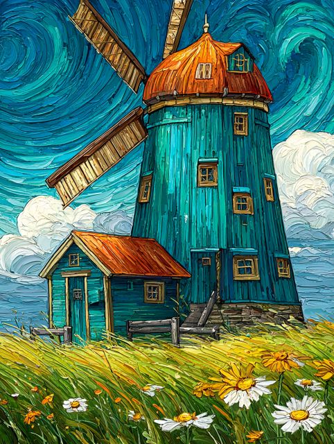 Step into the visceral vibrancy of Van Gogh's "Enigmatic Winds at Emerald Fields," where the chaotic serenity of nature meets the brilliance of expressionistic art. This visually arresting painting captures a dynamic emerald green field under the spell of swirling winds, depicted with thick, impassioned strokes of impasto that seem to dance with the wind itself. A rustic windmill, painted in intense shades of blue, stands as the sentinel of the fields, its arms moving in harmony with the unseen forces of nature. In the foreground, a delicate array of wooden clogs adorned with daisy chains adds a touch of rustic charm, while the sculpted cumulus clouds overhead echo the tumultuous energy below. This artwork is a testament to Van Gogh's pioneering spirit and his profound connection to the landscapes around him, rendered with emotive textures and vivid colors that plunge the viewer into a painterly tempest. *** About the Enigmatic Winds at Emerald Fields: Van Gogh painted this compelling scene in the late 1880s, during a period of profound experimental growth in both technique and emotional depth. The artwork embodies the characteristic elements of the Post-Impressionism movement, featuring bold, dynamic colors and dramatic, expressive brushwork that convey deeper psychological resonances. The windmill and swirling skies reflect Van Gogh’s fascination with the forces of nature and his ability to capture physical and emotional movement on canvas. This painting, like many of his works, narrates the struggle and beauty of rural simplicity. Though the exact location of this artwork is currently unknown, it remains a significant piece, embodying the turbulent beauty that defines Van Gogh's most celebrated works. Disclaimer: This is a digital reproduction inspired by the original artwork. It is not an official scan or photograph of the original painting.