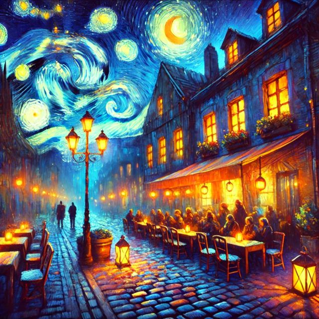 Under an otherworldly swirl of vibrant stars, a nostalgic scene unfolds that captures both the eye and the heart. This vivid reimagining of Van Gogh's "Starry Night Over the Rhone" juxtaposes the iconic, expressive sky with a quaint street scene, imbued with a warm, welcoming glow. Lanterns dance with gentle light, casting reflections upon cobblestone paths that lead to cozy, bustling cafes. Each stroke of the brush builds upon a tapestry of blues and yellows, creating a dynamic yet harmonious atmosphere. This artwork transports the viewer into a serene night where the chaos of life submits to the beauty of starlit tranquility. The depiction of figures meandering or gathered in lively conversations lends a human warmth, an invitation to join in the timeless camaraderie and contemplation that night-time settings often inspire. *** About the Starry Night Over the Rhone Reimagined ... Disclaimer: This is a digital reproduction inspired by the original artwork. It is not an official scan or photograph of the original painting.