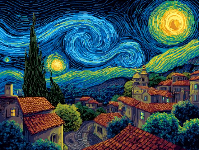Van Gogh's Starry Night: A Vivid Pixel Art Reimagining - by Van Gogh