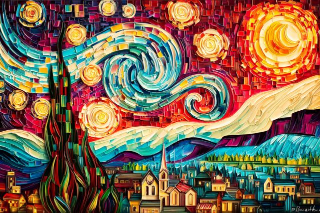 Bathed in a sea of blues and golds, Starry Night Over the Rhone captures the serene yet vibrant ambiance of the night sky as perceived by the artistic genius of Vincent van Gogh. Executed during his time in Arles, France, in 1888, this painting stands as a testament to Van Gogh's pioneering post-impressionistic style, characterized by bold and expressive brushwork, emotive use of color, and reflective layering of paint. The piece intimately merges natural beauty with human tranquility, depicting a couple strolling by the river under a sparkling celestial spectacle. The reflections of the gas lanterns shimmer on the water, juxtaposing the cosmic swirls overhead, inviting the viewer into a meditative contemplation of night's mysterious depths and humanity's place beneath the stars. Disclaimer: This is a digital reproduction inspired by the original artwork. It is not an official scan or photograph of the original painting.