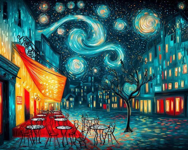 Bathed in a luminous glow, the cobblestone plaza brims with life under a swirling sky, reminiscent of Vincent van Gogh's visionary Café Terrace at Night. In this vivid reimagining, the café spills warm, inviting light onto the pavement, contrasting with the cool, mystical blue of the night. Tables wait patiently for visitors, adding a sense of anticipation. Above, the stars and sky whirl in dynamic swirls, pulling the viewer into a dream-like state that transcends time and place. This interpretation incorporates fantastical elements, reflecting the inherent emotions of solitude and contemplation while celebrating communal gathering spaces. The powerful brushstrokes and vibrant color palette enhance the dramatic and emotional effect, making the scene pulse with energy. *** About the Café Terrace at Night: Created in September 1888, Café Terrace at Night is often considered the first painting in which Vincent van Gogh used a star-filled sky. This pivotal piece marks a significant, creative period in Van Gogh’s career. The artwork is set in Place du Forum in Arles, France, and showcases van Gogh’s burgeoning interest in capturing night scenes under artificial light—a theme he explored more famously in later works like Starry Night over the Rhone and The Starry Night. The painting’s warm yellows and cool blues depict a vibrant, lively scene that merges the everyday with a hint of the ethereal, reflecting Van Gogh's perception of beauty in the night. Currently, the original Café Terrace at Night is housed at the Kröller-Müller Museum in Otterlo, Netherlands. This piece continues to be a testament to Van Gogh’s pioneering use of color and his ability to imbue ordinary scenes with profound emotional depth. Disclaimer: This is a digital reproduction inspired by the original artwork. It is not an official scan or photograph of the original painting.