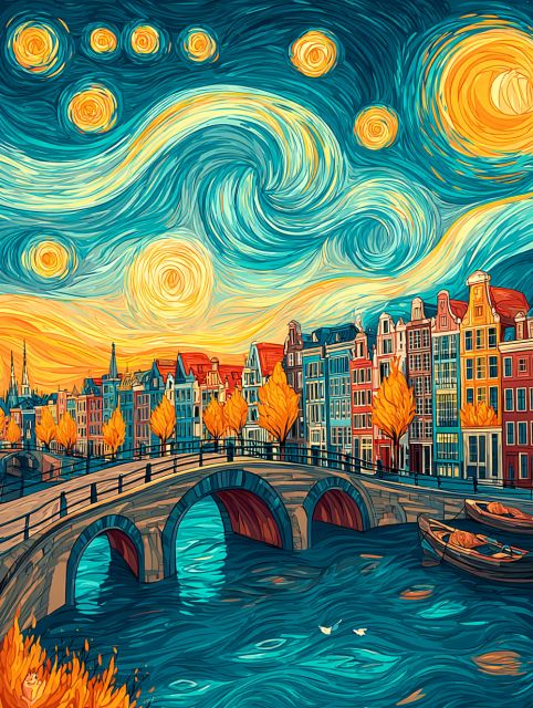 Bathed in the ethereal glow of an enchanting starry sky, "Starry Night Over the Amsterdam Canal" effortlessly captures the vigor and vibrancy of Amsterdam bathed beneath a swirling celestial display. The viewer is transported into a dreamscape where vivid blues and fiery yellows dance across the heavens, reflecting dynamic motion in the tranquil waters below. Inspired by the Post-Impressionist techniques of Vincent Van Gogh, this artwork breathes new life into the traditional Amsterdam skyline, integrating fantastical elements with the serene realism of the historic cityscape. Every brushstroke carries a rhythm, mimicking the lively pulse of Amsterdam’s bustling canals and the tranquil repose of its age-old bridges. *** About the Starry Night Over the Amsterdam Canal: Created in the evocative style reminiscent of Vincent van Gogh’s “Starry Night”, this artwork emulates the Post-Impressionist manner with a modern twist. While the original “Starry Night” was painted in 1889, this vibrant portrayal leans on the same emotional tone, showcasing a love for bold colors and dramatic, swirling sky patterns. This rendition fields a unique integration of iconic Van Gogh’s fervor with the familiar, picturesque canals of Amsterdam, thus marrying two disparate yet harmonious elements. Unlike many of Van Gogh’s works, which were deeply personal and portrayed mainly rural landscapes and scenes from his life, this painting frames a famous urban scene through a very personal lens. As with most works inspired by Van Gogh, the actual location of the original might vary, but the influence resonates in galleries and collections that favor bold expressions and rich, textured narratives. Disclaimer: This is a digital reproduction inspired by the original artwork. It is not an official scan or photograph of the original painting.