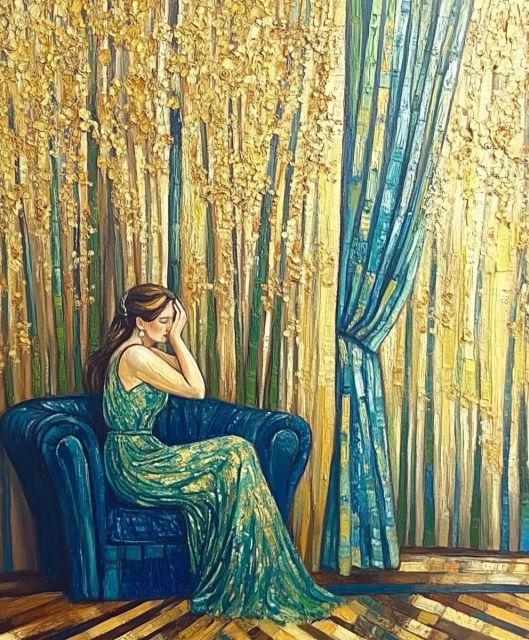 Bathed in a cascade of golden light and shadows, the painting reveals a woman seated, lost in her thoughts. The background, an exquisite tapestry of thick, textured brush strokes, radiates warmth that seems to echo the emotional depth of the subject’s reverie. Her flowing gown blends seamlessly with the drapery, merging hues of deep blue and vibrant gold, illustrating Van Gogh's unique influence on post-impressionist expression. This artwork captures the introspective melancholy and beauty through its vivid portrayal and dynamic use of color, demonstrating a profound grasp of human emotion and the power of surroundings. The brushwork is deliberately expressive, each stroke adding a layer of emotion and complexity, reflecting the artist's intent to delve into the psychological state of his subjects. *** About the Enigmatic Beauty of the Golden Drapery: Disclaimer: This is a digital reproduction inspired by the original artwork. It is not an official scan or photograph of the original painting.