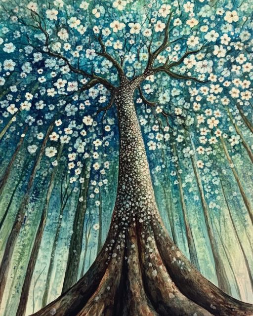 Enveloping the viewer in an atmospheric embrace of azure and emerald, "Van Gogh’s Blossoming Chestnut Trees" transcends ordinary floral depictions through an explosion of upward stretching branches and delicate blooms. Rendered in the Post-Impressionist style, each stroke of the brush conveys Van Gogh’s profound connection with nature, transforming the canvas into a vibrant, pulsating entity. The painting’s textured watercolor glaze enhances the ethereal quality, blurring the lines between reality and Van Gogh’s emotional landscape. This image successfully captures a fleeting moment of spring’s glory, with a tree’s mighty trunk anchoring a canopy of light-infused blossoms, reminiscent of stars twinkling against an evening sky. The use of vivid blues and greens against the stark contrasting whites binds this piece to the viewer's soul, inviting a profound contemplation of nature’s infinite beauty. *** About Van Gogh’s Blossoming Chestnut Trees: Vincent Van Gogh painted "Blossoming Chestnut Trees" in the spring of 1890 during his stay at the Saint-Paul asylum in Saint-Rémy-de-Provence. This period was marked by a burst of artistic creativity and a deep engagement with nature. The painting exemplifies Van Gogh’s iconic style, characterized by dynamic brushstrokes and vibrant color contrasts that convey emotion and movement. The chestnut tree, often a symbol of strength and perseverance, held special meaning for Van Gogh, representing both the bloom of new life and the resilience through his struggles with mental health. The story behind this artwork centers around Van Gogh’s exploration of renewal and his reverence for the natural world as a source of inspiration and solace. Currently, this painting is part of a private collection, occasionally loaned to museums for public viewing. Disclaimer: This is a digital reproduction inspired by the original artwork. It is not an official scan or photograph of the original painting.