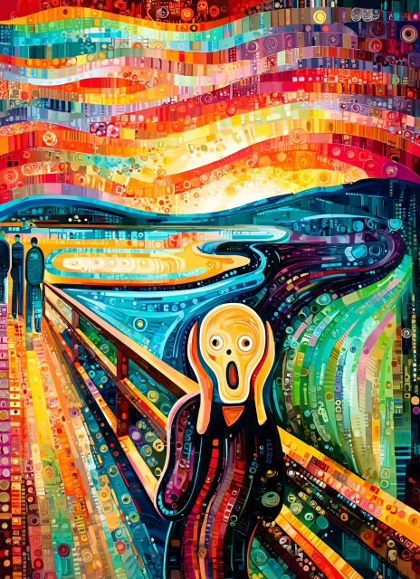 Swirling with vibrant colors and dynamic patterns, this exuberant reinterpretation of Edvard Munch's iconic "The Scream" pulls viewers into a whirlpool of emotion and energy. Unlike the stark, existential angst of the original, this rendition transforms the scene into a lively, digital-age mosaic. The central figure, with its haunting, open-mouthed wail, remains recognizable, but around it, the world has erupted into a symphony of colors and shapes, suggesting a more complex palette of emotions. This interpretation perhaps illustrates the overload of modern life and the continuous bombardment of sensory information that parallels the existential crises depicted in Munch's work. *** About the Artwork: Edvard Munch's "The Scream," originally painted in 1893, is one of the world's most famous images of psychological torment. The original painting depicts a figure with an agonized expression against a blood red sky, which Munch described as inspired by a sunset that turned the clouds "a blood red." He created this masterpiece during a tumultuous period which was marked by his own emotional and psychological distress. His innovative techniques—broad, gestural brushstrokes and the use of non-naturalistic color—helped to convey a powerful sense of anxiety. Today, the original painting is housed in the National Gallery, Oslo, but it has inspired countless reproductions and adaptations, reflecting its enduring impact on both art and popular culture. Disclaimer: This is a digital reproduction inspired by the original artwork. It is not an official scan or photograph of the original painting.