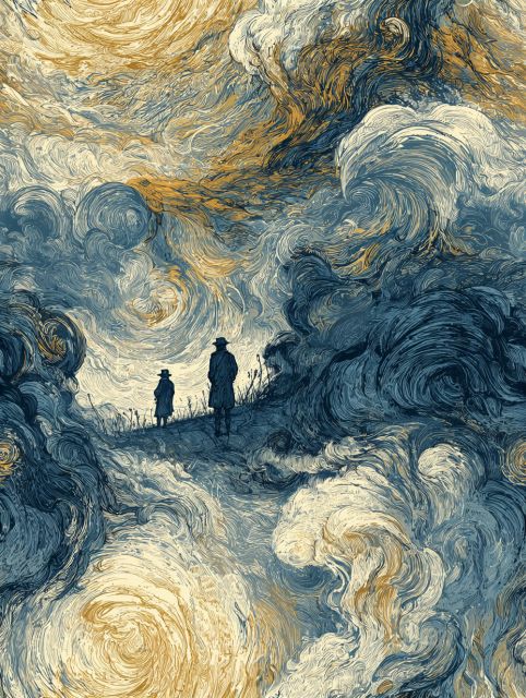 Bathed in an almost celestial light, "Silhouettes Under Swirling Skies" captures the imagination with its vibrant, undulating swaths of blue and gold that evoke the emotion and style of Vincent van Gogh’s "The Starry Night". This artwork, though modern in its creation, honors the legacy of Van Gogh by mimicking his iconic impasto technique where thick, expressive textures add a dynamic, three-dimensional effect. The painting portrays two distant silhouettes—a testament to human connection amidst nature's overwhelming presence. Each brushstroke conveys a whirlwind of emotions, swirling around the figures, encapsulating them in a dream-like tableau that stretches beyond the conventional boundaries of time and style. *** About "Silhouettes Under Swirling Skies": Created by a contemporary artist inspired by Vincent van Gogh’s post-impressionist methods, this artwork serves as both a tribute and a study in emotion through color and texture. Just like Van Gogh, the artist employs dramatic, swirling brushstrokes to evoke a sense of depth and movement within the canvas. This motif not only echoes the turbulent beauty of Van Gogh’s skies but also infuses the piece with a sense of the sublime, reflecting on how small and interconnected human lives are against the vast, expressive backdrop of the universe. The painting, while modern, feels as timeless as the pieces Van Gogh himself created at the end of the 19th century, filled with a similar melancholic yet poetic aura. Though not housed in a traditional gallery, this piece travels in exhibitions focused on Van Gogh’s influence on contemporary art, allowing audiences worldwide to witness its profound emotional resonance and technical beauty firsthand. Disclaimer: This is a digital reproduction inspired by the original artwork. It is not an official scan or photograph of the original painting.