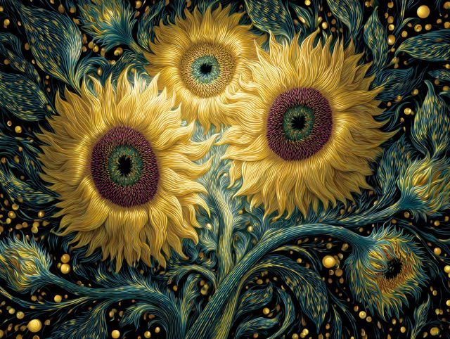 Immerse yourself in the swirling hues and vibrant textures of Van Gogh's masterpiece, "Sunflowers." This exceptional artwork transcends the ordinary, capturing the essence of sunflowers with a poignant intensity that beckons the viewer to look deeper. Each brushstroke is infused with Van Gogh's passion for nature, rendered with thick, expressive lines that seem to pulse with life. The golden yellows and deep greens speak of sun-drenched fields, while the sprawling, dynamic forms reflect an inner turmoil and longing. In this painting, we see not just flowers, but a reflection of human emotion, a metaphor for the cycles of life and resilience in the face of ephemerality. *** About the Sunflowers: Vincent van Gogh painted his iconic "Sunflowers" in 1888 during his time in Arles, France. This period marked a phase of heightened creativity and experimentation in Van Gogh's career. Unlike the typical still life that captures the transient beauty of flowers, Van Gogh's Sunflowers convey enduring emotional and symbolic meanings. The sunflowers in this series are painted with an intensity and sincerity that is palpably felt. They are not merely decorative but are imbued with deeper significance, reflecting themes of loyalty and devotion. This painting is part of a series that Van Gogh intended as a decoration for his friend Paul Gauguin’s room. Its current location varies as several versions exist, with this particular one residing in the Van Gogh Museum, Amsterdam. The artwork’s creative brushwork and vibrant palette have made it one of the most beloved and highly regarded pieces in the history of art. Disclaimer: This is a digital reproduction inspired by the original artwork. It is not an official scan or photograph of the original painting.