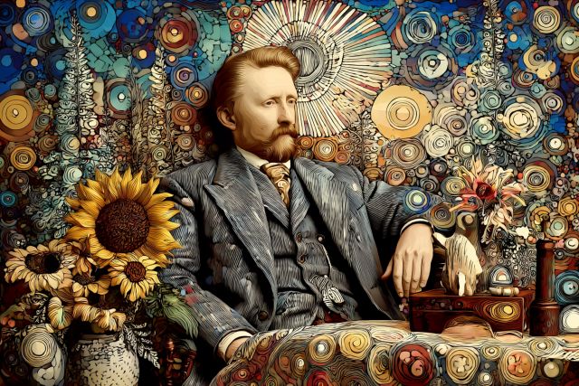 Van Gogh's Imaginative Portrait with Swirling Colors and Sunflowers - by Van Gogh