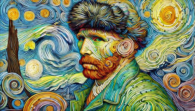 Infused with swirling blues and urgent, spiraling yellows, Van Gogh’s 'Self-Portrait with Bandaged Ear' transcends the traditional parameters of self-depiction. Created during intense emotional turmoil, the artist’s feverish brushstrokes and bold use of color convey a raw, unfiltered glimpse into his fragile psyche. The act of painting becomes a salve, a desperate measure of solace found through the alchemy of art. In this portrait, Van Gogh appears with a bandaged ear, a stark token of his infamous self-mutilation episode—an expression of deep personal suffering yet intriguing resilience. The background, ostensibly a chaotic sky reminiscent of 'Starry Night’, adds a dramatic, almost surreal quality that enhances the emotional depth of the work. His piercing gaze, set against this tempestuous backdrop, challenges the observer, almost piercing through the plane of canvas to grip the viewer’s own sense of stability and reality. Disclaimer: This is a digital reproduction inspired by the original artwork. It is not an official scan or photograph of the original painting.