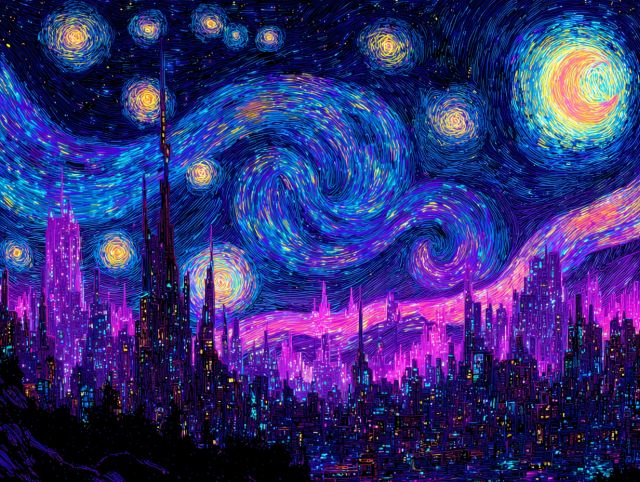 The Starry Night Reimagined in a Neon-Infused Cyberpunk Cityscape - by Van Gogh