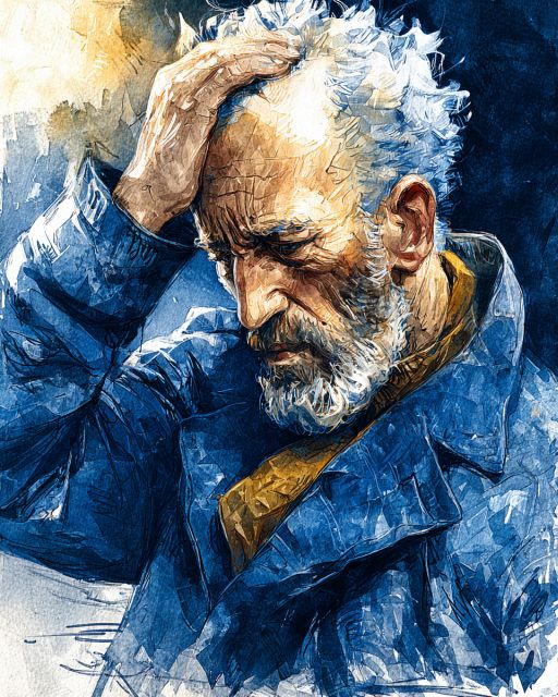 Captivated by hues of melancholic blue and turbulent strokes, "Old Man in Sorrow" by Vincent van Gogh is a poignant portrayal capturing the despair and existential anguish of an elderly man. This raw, uncompromising image delves deep into the human psyche, showcasing Van Gogh's unique ability to synthesize emotive energy and color. The textured watercolor brushwork amplifies the visceral impact, while the golden touches juxtapose the otherwise somber palette, offering a glimmer of hope amidst despair. The artwork not only reflects Van Gogh's sympathy towards human suffering but also his introspective exploration into the themes of solitude and melancholiness. *** About "Old Man in Sorrow": Van Gogh created this stirring painting in 1890 during his stay at the Saint-Paul asylum in Saint-Rémy-de-Provence. Mirroring the turbulent period of his life marked by mental anguish and isolation, the painting exemplifies his late artistic developments toward a more expressionistic approach. Van Gogh’s use of swirling brushstrokes and somber blues interspersed with bright yellows or golds convey not just the physical but the emotional landscape of the subject. This artwork was inspired by his observations of peasant life, emphasizing his enduring empathy and deep connection with the marginalized and downtrodden. Although many of Van Gogh’s artworks are held in renowned museums, the current location of "Old Man in Sorrow" isn't definitively known, creating a mystique around its viewing. Disclaimer: This is a digital reproduction inspired by the original artwork. It is not an official scan or photograph of the original painting.