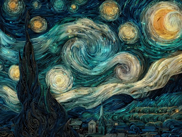 Immerse in the swirling cosmos of Vincent van Gogh's "Starry Night," where vibrant blues and fiery yellows collide in a celestial dance over the small, sleeping village of Saint-Rémy. Captured from the east-facing window of his asylum room at Saint-Paul-de-Mausole, Van Gogh transforms his view into a dynamic, emotional scene that transcends the ordinary limits of style and narrative. With its undulating curves and dramatic, engulfing swirls, the painting conveys deep inner emotions and the artist's contemplation of eternity and humanity's place in the universe. The bold, impasto strokes and the dramatic contrast between the serene village and the wild sky reflect Van Gogh's unique ability to convey emotion through color and form—a vivid testament to his pioneering spirit in the post-impressionist movement. *** About the Starry Night: Created during a pivotal period in 1889 while Van Gogh was voluntarily confined at the Saint-Paul-de-Mausole asylum in Saint-Rémy-de-Provence, "Starry Night" exemplifies his innovative approach to impasto painting. During this time, his style evolved to include swirling, highly texturized strokes that would come to characterize his most celebrated works. The painting's creation was influenced by his surroundings and the emotional depth of his mental state, reflecting his fascination with the nighttime and cosmic visions. Van Gogh’s depiction of the heavens communicates his desire for consolation and relief from his mental turmoil. "Starry Night" resides in the permanent collection of the Museum of Modern Art in New York, epitomizing its stature as one of the most beloved and recognized paintings in the annals of Western art. Disclaimer: This is a digital reproduction inspired by the original artwork. It is not an official scan or photograph of the original painting.