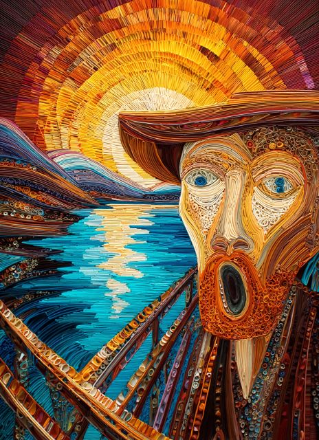 Awash in vivid swirls and intense color harmonies, "Self-Portrait with Straw Hat" peers out with an expression of profound emotion, encapsulating the essence of Van Gogh's inner turmoil and genius. The painter's eyes, wide and arresting, capture the viewer with a gaze that is both haunting and inviting, suggesting an unspoken narrative deeply rooted in both personal struggle and artistic exuberance. The vibrant textures and lines create a vivid contrast against the serene palette of blues and oranges in the backdrop, manifesting the dynamic interplay of light and shadow. Van Gogh’s bold, impulsive brush strokes carve out not only his features but also his psychological state, offering an intimate glimpse into the artist's troubled yet brilliant mind. ***About the "Self-Portrait with Straw Hat": Vincent van Gogh painted this compelling self-portrait in the late 1880s, during a period of prolific output and significant personal challenges. Known for his expressive and emotive style, this artwork exemplifies the Post-Impressionistic technique that Van Gogh perfected, prioritizing emotional depth over realistic depiction. This painting was inspired by his ongoing quest for personal and artistic identity, reflected in the raw, compelling emotion displayed. Currently, the artwork’s location is not definitively known as it is part of private collections and is occasionally loaned to museums worldwide for exhibitions. Disclaimer: This is a digital reproduction inspired by the original artwork. It is not an official scan or photograph of the original painting.