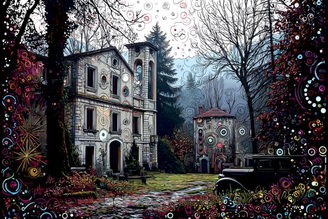 Bathed in the melancholic light of a foggy autumn morning, 'Enigmatic Estate in Autumn: A Vision in Neo-Impressionist Style' captures a surreal and dreamlike vision that transcends the ordinary. This artwork, not originally by Vincent Van Gogh but evoking a similar spirit, enchants viewers with its rich tapestry of swirling colors and an ethereal atmosphere. The use of vibrant hues and dynamic swirls create a mesmerizing scene that invites viewers to explore the mysterious estate shrouded in mist and decorated with esoteric symbols. Through meticulous brushwork and an imaginative color palette, this piece expresses the emotional depth and beauty of an autumnal landscape transformed by a profound narrative voice. *** About the Enigmatic Estate in Autumn: This artwork, while inspired by styles reminiscent of Van Gogh, diverges into a unique interpretation, blending elements of both Impressionism and Expressionism. The neo-impressionist technique here allows for an exploration of light and color dynamics that echo the emotional intensity often found in Van Gogh’s works. The inspiration for this image is a poetic reflection on the passage of time and nature’s quiet decay, wrapped in the beauty of an everlasting moment. The location of the original estate or the artwork’s current placement remains a mystery, adding to its enigmatic allure, and invites the viewer to a contemplative journey into the heart of autumn’s serene yet vibrant landscape. Disclaimer: This is a digital reproduction inspired by the original artwork. It is not an official scan or photograph of the original painting.