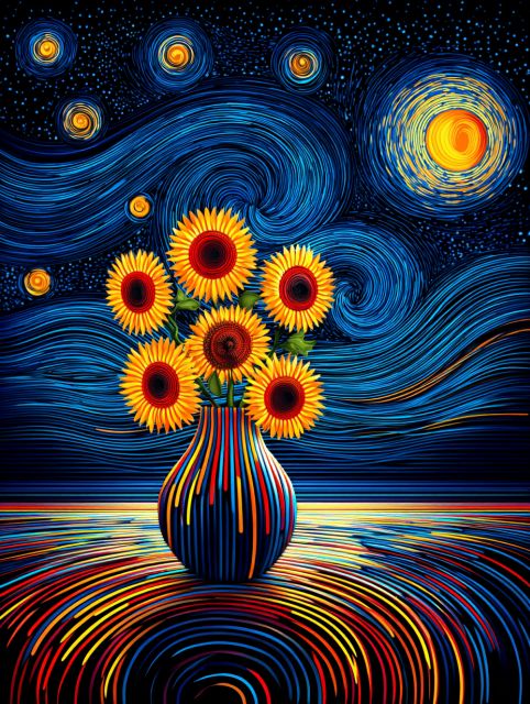 Immerse yourself in a captivating fusion where Van Gogh's iconic "Starry Night" and his vibrant "Sunflowers" converge. This artwork envelops the viewer in a mesmerizing swirl of deep blues and bright yellows, mirroring the dynamic tension and emotional depth for which Van Gogh is renowned. The lush, golden sunflowers burst with life, stark against the tumultuous, swirling backdrop of the star-studded night. Every brushstroke resonates with Van Gogh's signature style, combining bold, dramatic lines with a profound sense of movement and texture. The piece evokes a sense of wonder and introspection, inviting the viewer to ponder the contrasts between tranquility and chaos, light and darkness, growth and eternity. *** About the Artwork: While not an authentic piece from Van Gogh's own hand, this work beautifully melds two of his most famous paintings, created during his time in France in the late 1880s. "Starry Night" was painted in 1889 from his asylum room at Saint-Rémy-de-Provence and depicts the view from his window, enhanced by his imagination. "Sunflowers," part of a series painted in Arles in 1888, signifies his experiment with color and impasto. This synthesized artwork, while a modern creation, remains true to Van Gogh's explorations of hope, emotion, and beauty, making it both a tribute and a continuation of his artistic legacy. The original "Starry Night" is currently housed in the Museum of Modern Art in New York, and the "Sunflowers" can be seen at the Van Gogh Museum in Amsterdam. Disclaimer: This is a digital reproduction inspired by the original artwork. It is not an official scan or photograph of the original painting.