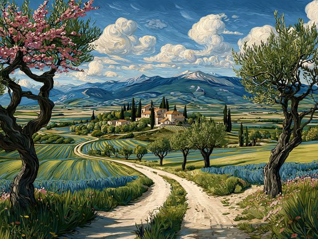 Enveloping the senses with its vivid portrayal of nature's rebirth, "Springtime Path through Blossoming Orchards" captures the essence of spring in a manner only Vincent van Gogh could achieve. In this enchanting scene, a serene path winds through an exuberant display of flowering trees, beneath an expansive, swirling sky. Using his signature dynamic brushstrokes, Van Gogh infuses life into the landscape, the vivid blues and greens of the fields contrasting sharply with the soft pinks and whites of the blossoms. The composition draws the viewer's eye deep into the pastoral beauty of Auvers, offering a sense of both movement and tranquility. This piece is a testament to Van Gogh's profound connection with nature and his unique ability to convey emotion through his bold, impressionistic techniques. ***About the Springtime Path through Blossoming Orchards: Van Gogh painted this masterpiece in the spring of 1890, during the final months of his life in the French village of Auvers-sur-Oise. Embodying the Post-Impressionist style, this work is characterized by expressive, vivid color contrasts and dramatic, gestural applications of paint. The inspiration likely came from Van Gogh's fascination with the regenerative powers of nature and his attempts to capture the fleeting effects of light and color. Today, this iconic piece is showcased in a renowned museum, allowing admirers from around the world to witness its timeless beauty and the emotional depth of Van Gogh’s artistic vision. Disclaimer: This is a digital reproduction inspired by the original artwork. It is not an official scan or photograph of the original painting.
