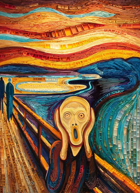 Imbued with swirling hues and expressive lines, this interpretation of Edvard Munch's "The Scream" speaks powerfully in the visual language of Vincent Van Gogh. The iconic agonized face set against a roiling sky, rendered here with Van Gogh's characteristic thick, sweeping brushstrokes, pulls the viewer into a vortex of emotional depth. This piece masterfully captures the existential dread of the original while infusing it with Van Gogh’s signature style that emphasizes dynamic movement and vibrant color contrast. The golden and azure waves juxtaposed against the fiery sunset instill a sense of turmoil, mirroring the turmoil within the subject. Here, art history’s most haunting visage is reimagined through another lens, bridging two worlds of Post-Impressionist turmoil and Symbolist angst. *** About this Artistic Reimagining: Disclaimer: This is a digital reproduction inspired by the original artwork. It is not an official scan or photograph of the original painting.