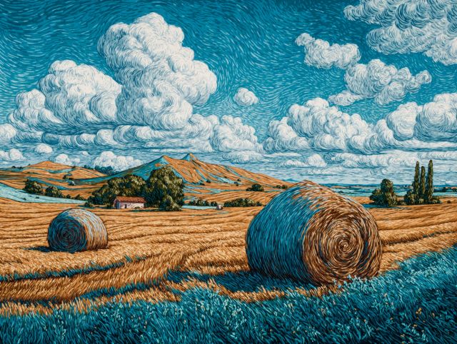 Amidst the tranquil azure skies, Vincent van Gogh's "Sheaves of Wheat Under Swirling Clouds" captures the boundless vitality of the rural landscape, immortalizing it in vigorous, passionate strokes. This masterpiece encapsulates Van Gogh’s tumultuous emotions through its vivid play of colors and dynamic textures. The painting features robust sheaves of wheat, bathed in golden sunlight, set against a backdrop of tumultuous blue and white skies. The energetic movement of the clouds echoes the inner turmoil and intense emotion Van Gogh often expressed in his letters. The juxtaposition of the serene wheat field with the dynamic sky creates a palpable tension, offering a glimpse into the artist's poignant state of mind during his later years. The intricate brushwork and bold use of color not only emphasize the emotional depth but also demonstrate Van Gogh’s pioneering role in the evolution of modern art. *** About Sheaves of Wheat Under Swirling Clouds: Created in the last weeks of July 1890, just days before his untimely death, "Sheaves of Wheat Under Swirling Clouds" is one of Van Gogh’s final paintings, a period marked by profound creativity and intense psychological struggle. This artwork is steeped in the Symbolist movement, where subjects are imbued with deeper meanings and emotions. Van Gogh's fascination with the rural and the agrarian lifestyle is perceptible, as he believed these themes represented the essence of life and renewal. Drawing inspiration from his surroundings at Auvers-sur-Oise, France, Van Gogh depicted the wheat fields which he observed from his asylum's window. This painting, conveying both hope and despair, offers a powerful psychological insight into the final days of his life. Although the precise current location of the original painting might be uncertain, it resonates widely in reproductions and is celebrated in multiple art collections globally. Disclaimer: This is a digital reproduction inspired by the original artwork. It is not an official scan or photograph of the original painting.