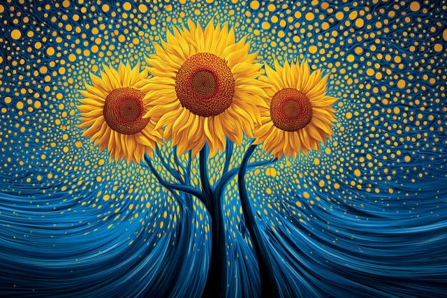As if swaying gently in a serene, rhythmic dance, the trio of sunflowers bursts from the canvas with a vibrant vitality that is distinctly reminiscent of Vincent van Gogh's original masterpiece. This imaginative reinterpretation features rich, swirling patterns that echo the energy and emotion of Van Gogh’s strokes, yet introduces a modern twist inspired by the designs of Ross Lovegrove and Stefan Sagmeister. The colors are vivid: golden yellows of the sunflowers stand sharply against a dynamic, deep blue background speckled with lighter blues and whites, suggesting a cosmic, starry night sky. This unique blend of historical artistry and contemporary design invites the viewer into a fusion of time periods, marrying the past's passion with today's innovative aesthetics. *** About the Sunflowers Reinterpreted in Modern Patterns: Van Gogh's original Sunflowers were painted in 1888, during a period when the artist was experimenting with the expressive possibilities of color and impasto, a technique involving thickly laid paint. This series of sunflower paintings, which were meant to decorate his friend Paul Gauguin's room, symbolizes happiness and devotion. The original paintings evoke warmth and joy, contrasting sharply with the often tumultuous inner life of the artist. This reinterpretation, while maintaining the symbolic sunflowers, infuses the artwork with modern artistic elements inspired by organic forms and typographic designs seen in the works of Lovegrove and Sagmeister. The swirling patterns surrounding the sunflowers may be interpreted as both an homage to Van Gogh’s style and a nod to modern design aesthetics that emphasize fluid, natural lines. The current location of many of Van Gogh's Sunflowers originals is well-documented; for instance, one version is in the Van Gogh Museum in Amsterdam. However, this contemporary interpretation’s location would depend on its exhibition status or ownership. Disclaimer: This is a digital reproduction inspired by the original artwork. It is not an official scan or photograph of the original painting.