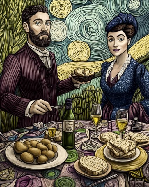 Plunging into the rich tapestry of an Art Deco reinterpretation, this imaginative adaptation of Van Gogh's "The Potato Eaters" captivates with its symphony of vibrant colors and elegant patterns. Reimagined in a style that harmonizes the rustic essence of the original 1885 masterpiece with the streamlined aesthetics of the 1920s Art Deco movement, the artwork breathes new life into Van Gogh’s depiction of peasant life. The swirling patterns in the background draw inspiration from Van Gogh's iconic 'Starry Night', while the figures are adorned with sharp, refined lines and vivid, contrasting hues that echo the opulence of the Art Deco era. This piece artfully combines the poignant simplicity of the subjects’ faces and the detailed, luxurious surroundings, creating a dramatic yet intimate tableau that invites viewers to reconsider the narratives of classic artworks through modern artistic lenses. *** About The Potato Eaters: Reimagined in Art Deco Style: Originally painted in 1885, "The Potato Eaters" represents Vincent van Gogh's ambition to depict peasant life authentically and with empathy, aiming to show the reality of hardship and manual labor. This reimagined version transitions from the dark, somber tones of the original to a lively, graphic representation characteristic of Art Deco. It retains the original's emotional depth while introducing geometric symmetry and metallic colors typical of the new style it adopts. Art Deco, known for its rich colors, bold geometry, and decadent detail work, offers a stark contrast to the original's subdued palette and rough textures. The inspiration behind this reinterpretation likely stems from a desire to fuse historical narrative with contemporary art styles, reflecting how past experiences can be viewed through varying cultural lenses. The current location of this reimagined artwork is not documented, as it may be a recent creation possibly held in a private collection or awaiting exhibition. Disclaimer: This is a digital reproduction inspired by the original artwork. It is not an official scan or photograph of the original painting.