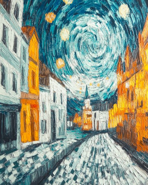 Immerse yourself in a visual spectacle where Van Gogh's renowned Starry Night Over the Rh么ne collides with a cosmic burst of neon dreams. This artistic rendition reimagines the tranquil scene of the original masterpiece under a swirling, dream-like sky that dazzles with vibrant, luminous hues. Tangerine and golden strokes dance across quaint buildings, mirroring a fiery reflection on the cobblestone path that guides the viewer's gaze towards a faintly outlined silhouette of the old church tower. The sky, animated by dynamic light bursts, infuses the piece with a surreal, otherworldly essence, making it feel as though one is gazing through a portal into an alternate vibrant universe. The blending of Van Gogh's impressionistic style with electrifying cosmic elements invites a stark contrast that highlights the stirring beauty of an endless, starlit night. *** About the Starry Night Over the Rh么ne: This masterpiece was originally created by Vincent van Gogh in 1888, during his time in Arles, which was one of the most productive periods of his career. Inspired by the night sky and the effects of light at night, Van Gogh鈥檚 work showcases his revolutionary use of color and bold, dramatic brush strokes. The original Starry Night Over the Rh么ne is a prime example of the artist's fascination with the nocturnal beauty and the reflections in water. This piece, though infused with vibrant, unnatural colors in this iteration, echoes the emotional depth and the painter's tendency to infuse his works with emotional realism. The original painting is located in the Mus茅e d'Orsay, Paris, and continues to captivate audiences with its serene depiction of the reflective waters and the night sky. Disclaimer: This is a digital reproduction inspired by the original artwork. It is not an official scan or photograph of the original painting.