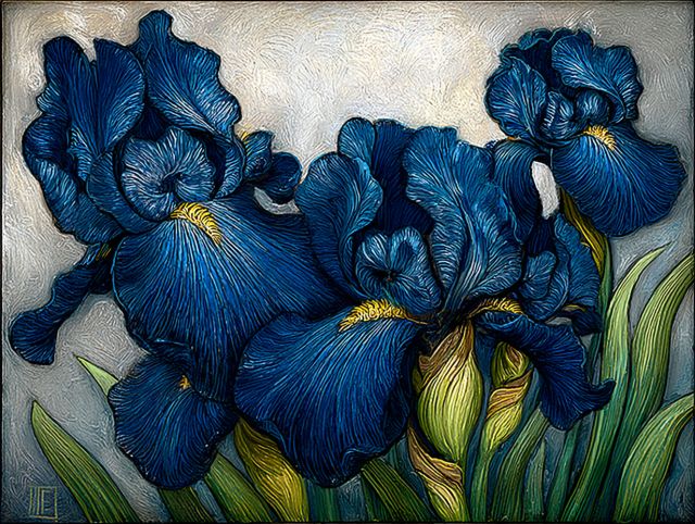 Bathed in shades of deep blue and vibrant indigo, Vincent Van Gogh’s “Irises” mesmerizes with its bold, expressive brushstrokes that dance across the canvas. These irises, each petal rendered with palpable energy and emotion, seem almost in motion against the sober, pale background. Painted in 1889 during his stay at the asylum in Saint-Rémy, Van Gogh captures not just the iridescent beauty of the flowers but also a sense of fleeting, almost poignant transience. The intertwining leaves and blossoms, underscored by contrasts of yellow and green, highlight Van Gogh’s unique ability to transform a simple floral subject into a profound metaphysical statement, celebrating the resilience and enchanting simple beauty of nature. *** About the Irises: Vincent Van Gogh created this masterpiece in May 1889, at a time when he was deeply influenced by Japanese woodblock prints, which is evident in the flat, decorative compositions and clear contours. This piece reflects a departure from the technique of impasto Van Gogh commonly employed; rather, it is marked by a softer, more detailed approach akin to Pointillism, emphasizing texture and color contrast over the thickness of the paint. “Irises” was one of the first paintings he made while at the asylum in Saint-Rémy, a period during which his mental health battles paradoxically fueled his artistic output. Inspired by the hospital’s garden, the artwork serves not only as a testament to Van Gogh’s eye for beauty in the mundane but also as an emblem of hope amidst adversity. Today, this painting is housed in the J. Paul Getty Museum in Los Angeles, adding to its storied history a contemporary chapter of admiration and study. Disclaimer: This is a digital reproduction inspired by the original artwork. It is not an official scan or photograph of the original painting.