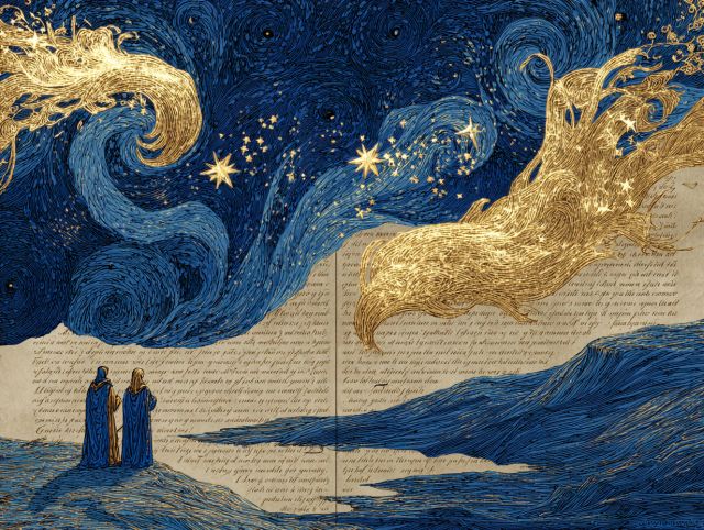 Stepping into the golden swirls and deep azure sky of the Illuminated Manuscript of Van Gogh's The Starry Night, the viewer is enveloped in a world where medieval artistry collides with post-impressionist brilliance. This inventive illustration reinterprets the iconic work of Van Gogh as a gothic illuminated manuscript. The dramatic, almost celestial movement of the heavens is captured with intricate gold leaf that speaks of ancient scripture, while beneath, tiny robed figures echo the fragility and solitude of humanity against the universe's vast backdrop. This depiction not only honors Van Gogh’s original vision but also crafts a sublime narrative at the intersection of historical traditions and modern artistry. *** About the Illuminated Manuscript of The Starry Night: This artistic reimagining brings a medieval perspective to Van Gogh's masterpiece, The Starry Night, originally painted in 1889. The original artwork, inspired by the view from his asylum room at Saint-Paul-de-Mausole near Saint-Rémy-de-Provence, brilliantly captures the emotional intensity and beauty of the night sky. Van Gogh’s passionate brushwork and bold color choices reflect his inner turmoil and yearning for serenity. Now housed in the Museum of Modern Art in New York, The Starry Night's undulating stars and moon have captivated viewers for over a century. This medieval manuscript-style reproduction transcends time, blending ancient European artistic techniques with Van Gogh's post-impressionist style to create a unique visual homage that connects diverse historical periods through shared human experiences and artistic values. Disclaimer: This is a digital reproduction inspired by the original artwork. It is not an official scan or photograph of the original painting.
