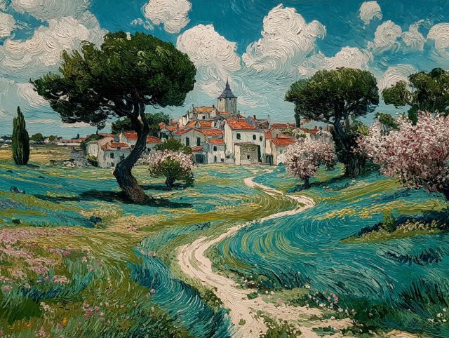 Vibrant swirls of blue and green dominate the canvas of "The Lush Springtime at Auvers with Blossoming Peach Trees", where Vincent van Gogh masterfully captures the essence of spring in Auvers-sur-Oise. The eye travels along a sinuous path, edged by the exuberant flush of peach blossoms, irresistibly drawn towards the quaint village structures in the distance. Van Gogh's signature brush strokes evoke a sense of movement, almost as if the wind itself dances through the trees and over the fields. This painting, rich in color and emotion, offers a glimpse into the artist’s profound connection with nature and his exceptional ability to convey his intense perceptions through bold, impassioned visuals. The vivid portrayal of the sky, a dynamic tumult of swirling clouds, contrasts dramatically with the tranquil village, creating a harmonious blend of turmoil and peace. *** About The Lush Springtime at Auvers with Blossoming Peach Trees: Created during the final months of Van Gogh's life, in 1890, this masterpiece reflects the artist's renewed interest in the idyllic landscapes and rural settings of Auvers-sur-Oise. The style of this piece is quintessentially post-impressionistic, characterized by expressive color, emotive symbolism, and distinct brush strokes that convey depth and emotion rather than precise reality. The artwork is inspired by Van Gogh's fascination with the renewing qualities of nature and his attempts to capture the essence of the changing seasons through his intense, vivid palette. Currently, its location is not widely publicized, preserving its mystique and splendor for those fortunate enough to view it in person, ensuring it remains an enduring enigma in the art world. Disclaimer: This is a digital reproduction inspired by the original artwork. It is not an official scan or photograph of the original painting.