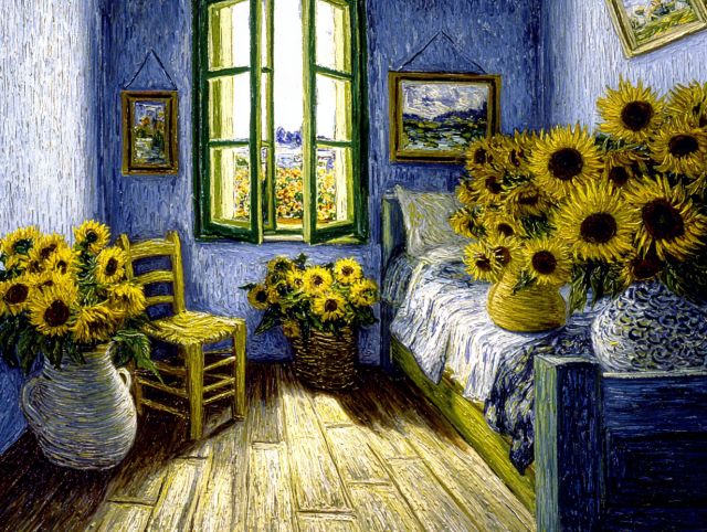 Bathed in the tender glow of sunlit warmth, "Sunflowers Illuminating Van Gogh's Arles Bedroom" is a captivating canvas where joy and solitude dance under the brush strokes of Vincent van Gogh. In this intimate composition, the rustic charm of a simple bedroom in Arles is brought to life with an abundance of golden sunflowers. Each bloom is rendered with passionate, swirling strokes, emitting a glow that seems to charge the very air of the room with a serene, comforting energy. The luminous yellow petals contrast starkly against the cool lavender walls and the verdant green of the open window, through which hints of a bright, inviting day can be seen. This setting is not just a room but a sanctuary, where Van Gogh not only slept but where he created, thought, and existed—a place profoundly personal and infinitely artistic.*** About the Sunflowers Illuminating Van Gogh's Arles Bedroom with Vibrant Warmth: Created in 1889, during Van Gogh's prolific period in Arles, this painting reflects his deep emotional connection with sunflowers, which he associated with gratitude and friendship. Employing thick, expressive brush strokes and vibrant contrasts, typical of his post-impressionistic style, Van Gogh's technique brings an almost tactile texture to the scene. This artwork delves into the theme of isolation juxtaposed with the beauty found in nature—a recurrent element in Van Gogh’s works. The sunflowers, resting both in vases and framed on the walls as paintings within the painting, symbolize Van Gogh's fascination with recursive artistry and his endeavor to capture the transient beauty of flowers. The original painting is a treasured piece of the Van Gogh Museum in Amsterdam, where it continues to enchant visitors, offering a window not only into Van Gogh's artistic genius but also his personal saga. Disclaimer: This is a digital reproduction inspired by the original artwork. It is not an official scan or photograph of the original painting.