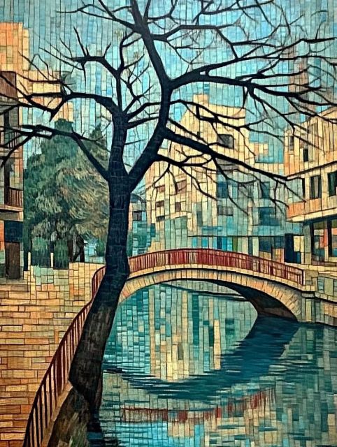Striking linear geometry and a vibrant interplay of shapes reimagine Van Gogh’s Bridge across the Seine at Asnières. The bold lines and angular forms of Constructivism transform the soft, flowing river into a tapestry of abstract blocks and tessellations, highlighting the contrast between natural curves and industrial solidity. The stark, leafless tree, a central figure in the composition, stretches its branches over the scene, mirroring the bridge’s arc with its own stark silhouette. This reimagined artwork captivates with its dynamic tension between natural elements and human-made structures, reflecting an intriguing fusion of two distinct artistic styles. The palette, comprised of muted blues, earthy browns, and hints of red, emphasizes the cold, austere beauty of the scene, inviting the viewer to explore Van Gogh’s impressionistic sensibilities through the lens of Constructivist rigor. *** About the Bridge across the Seine at Asnières in Constructivist Style: This piece is an artistic reinterpretation of one of Vincent van Gogh’s earlier works, originally painted in 1887. While Van Gogh's original painting was deeply rooted in Impressionism, capturing moments of everyday life with emotional depth and vibrant color, this reimagined version adopts the stark, geometric aesthetics of Constructivism. Constructivism originated in Russia in the early 20th century, characterized by an abstraction that emphasized technology and materials, often reflecting modernity and a utopian vision of industrial society. This version of Van Gogh's work incorporates those themes, presenting a novel interpretation that bridges 19th-century artistic emotion with 20th-century abstract exploration. The inspiration behind the original included Van Gogh’s fascination with the French rural landscape and the working-class people inhabiting it, often emphasizing the harmony between humans and nature. The current location of this reimagined artwork is not specified but continues to inspire discussions on the convergence of art styles and periods. Disclaimer: This is a digital reproduction inspired by the original artwork. It is not an official scan or photograph of the original painting.