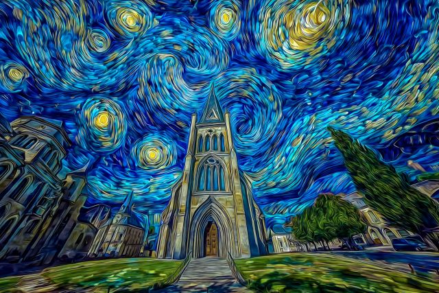 Bathed in the mystical glow of a vivid, swirling night sky, "Moonlit Enchantment: Van Gogh's Church at Auvers under Starry Skies" invites viewers into a world where Gothic architecture and celestial wonder converge. Van Gogh's signature brush strokes dance across the canvas, creating dynamic, flowing movements that mimic the emotional tumult within him. The church, standing regal and steadfast under the cosmic whirlpool, serves as an anchor in the tempest of blue and yellow hues. This painting, an imaginative blend of "The Church at Auvers" and "Starry Night," portrays not just a place, but a poignant exploration of faith, solitude, and the universe’s eternal beauty. *** About Moonlit Enchantment: Van Gogh's Church at Auvers under Starry Skies: Envisioned as a synthesis of two of Vincent van Gogh’s most profound works, this piece marries the serene, structured depiction of "The Church at Auvers" painted in June 1890, shortly before his death, with the vibrant turbulence of "Starry Night" painted a year earlier. The artwork is a visual representation of Van Gogh’s struggle with his spiritual and emotional existence. This fusion emphasizes Van Gogh’s unique ability to convey emotion through the tumultuous skies and the tranquil yet prominent Gothic church structure. The original "The Church at Auvers" is housed at the Musée d'Orsay in Paris, emphasizing its continued relevance and reverence in the art world. The style, characterized by its expressive, swirling brush strokes and bold, unrealistic colors, showcases Van Gogh’s post-impressionistic leanings which focus intensely on personal expression. The redistribution of these elements in a single frame beckons a deeper understanding of his artwork and mentality, making it a profound study for historians and art lovers alike. Disclaimer: This is a digital reproduction inspired by the original artwork. It is not an official scan or photograph of the original painting.