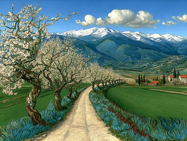 Awaken your senses with the vibrant colors and dynamic brush strokes of "Blossoming Chestnut Trees," a masterpiece by Vincent van Gogh that celebrates the rebirth and beauty of spring. In this painting, a path winds invitingly through a lively tableau of chestnut trees, their branches adorned with delicate white blooms against a backdrop of lush green fields and distant mountains. Van Gogh’s signature bold, expressive lines capture the movement of the wind, while brilliant blues and greens contrast starkly with the soft white of the blossoms, creating a visual symphony of color and emotion. The commanding presence of the mountains in the background juxtaposes the ephemeral beauty of the flowers, suggesting a poignant reminder of nature’s cycle of life and renewal. *** About Blossoming Chestnut Trees by Van Gogh: This luminous artwork was created in the spring of 1890 during Van Gogh's prolific period in Saint-Rémy-de-Provence. Here, Van Gogh explored the transformative power of color and its emotional depth. The style is quintessentially Post-Impressionist, characterized by its vivid colors, emphatic brushwork, and contoured forms—a departure from the naturalism of his earlier works. Inspired by the rejuvenating landscapes of the Provence region, Van Gogh sought to capture the essence of spring and its promise of new beginnings. This painting not only reflects his deep appreciation of nature but also resonates with his inner turmoil and hope during his final months. Currently, "Blossoming Chestnut Trees" finds its home in a major museum collection, continuing to inspire and captivate audiences with its timeless beauty and emotional depth. Disclaimer: This is a digital reproduction inspired by the original artwork. It is not an official scan or photograph of the original painting.