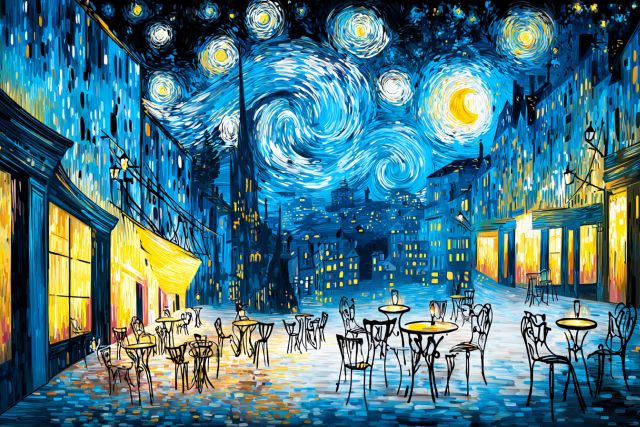 Imbued with a deep trance of swirling stars and a vivid play of colors, this artistic interpretation marvelously reenvisions Vincent van Gogh’s iconic "Cafe Terrace at Night". The scene transforms under the influence of modern designers Ross Lovegrove and Stefan Sagmeister, drenched in the ethereal glow of celestial patterns that dance over the café setting. In this rendition, the café spills warm yellow light onto cobblestone pavements that now twirl under a dynamic, starlit sky. Not merely a place, but a moment in perpetual celebration of life and cosmic beauty, the terrace invites viewers to linger over unseen conversations and unwritten stories whispered between the lines of reality and imagination. Here, expressionist tempos meet organic design, creating a bridge between 19th-century post-impressionism and contemporary aesthetic explorations. *** About the Artwork: Originally painted by Vincent van Gogh in September 1888, "Cafe Terrace at Night" is an exemplar of the artist's interest in capturing the effervescent spirit of ordinary locales under exceptional nocturnal light. This painting, which hangs in the Kröller-Müller Museum, is lauded for its vivid colors and emotional depth, characteristics that echo through this imaginative reinterpretation. The original work marked a significant departure from the traditional black tones used in nocturnal scenes, introducing Van Gogh’s pioneering use of color and light that would come to define his late works. The redesign inspired by Lovegrove and Sagmeister infuses the composition with a biomorphic structure and typographically inspired whimsy, suggesting a harmonious dialogue between Van Gogh's post-Impressionist roots and modern design theories. This fusion not only celebrates Van Gogh’s legacy but also nods to contemporary design’s potential to reinterpret historical vistas. Disclaimer: This is a digital reproduction inspired by the original artwork. It is not an official scan or photograph of the original painting.