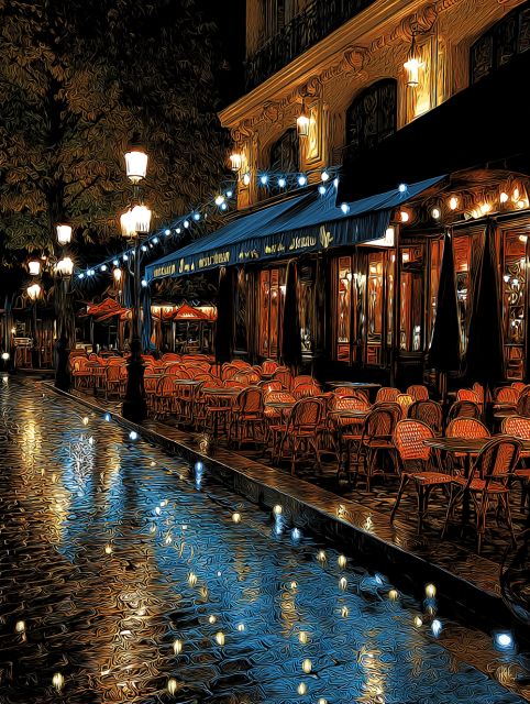 Step into the luminous and bustling atmosphere of Vincent van Gogh's "The Vibrant Energy of the Café Terrace on a Starry Night," where the golden hues of the café lights blend with the rich blues of a nocturnal sky. This masterful painting captures the essence of a warm, lively evening in the heart of Arles, France. Van Gogh's distinct brush strokes and bold color choices invite the viewer to feel the gentle warmth of the café and hear the distant murmur of conversation among patrons. The artwork vividly portrays the reflective cobblestone pavement, adding a shimmering texture that enhances the night's enchantment, making the scene pulsate with life and color. Disclaimer: This is a digital reproduction inspired by the original artwork. It is not an official scan or photograph of the original painting.