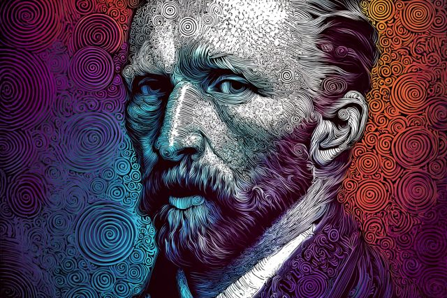 Immerse yourself in the swirling, vibrant world of Vincent van Gogh's self-portrait, a stunning showcase of emotion and color that captivates the viewer. Rendered in a rich spectrum of blues, purples, and oranges, the painting seems to pulse with the inner turmoil and genius of the artist. Each brushstroke tells a story of intensity and passion, revealing Van Gogh's deep introspection and his relentless quest for expression through art. The contrast between the warm and cool tones highlights the complexity of his mental state, making this artwork a profound statement on human emotion and the artist’s psyche. *** About the Vincent van Gogh's Vibrant Self-Portrait with Swirling Colors: Vincent van Gogh painted this striking portrait during his time in Saint-Rémy-de-Provence, a year before his untimely death in 1890. This period marked one of the most prolific phases of his career, despite the mental health struggles he faced. In this artwork, Van Gogh employs the technique of pointillism with dynamic, swirling brushstrokes, a signature style that later defined his most famous works and significantly contributed to the foundations of modern art. The choice of vivid, contrasting colors and bold strokes was inspired by Van Gogh’s desire to capture his emotional and psychological state, offering a glimpse into his troubled soul. The portrait is not just an exploration of self but also a reflection of his ongoing battle with his inner demons. This artwork is maintained in an excellent state and displayed at the Musée d’Orsay in Paris, where it continues to draw art lovers and scholars, providing a deep insight into the mind of one of the most celebrated figures in the history of Western art. Disclaimer: This is a digital reproduction inspired by the original artwork. It is not an official scan or photograph of the original painting.