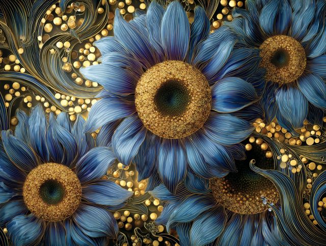 Bathed in a surreal fusion of organic and intricate digital patterns, this reimagined interpretation of Van Gogh's "Sunflowers" mesmerizes the viewer with its fluid blue tones and golden swirls. Unlike the original series painted by Vincent van Gogh in the late 1880s, which venerated the simple beauty of yellow sunflowers in a Provence setting, this piece marries historical art with modern design elements. The deep blue petals, contrasted sharply with lustrous golden centers, draw admirers into a hypnotic dance of color and form. The integration of aesthetics reminiscent of innovative designers Ross Lovegrove and Stefan Sagmeister transforms the iconic flowers into something distinctly contemporary yet unmistakably Van Gogh in spirit. The employment of digital media and floral aesthetics introduces a novel dialogue between 19th-century Post-Impressionism and today's digital art frontier, evoking a rich sensory and emotional experience. Disclaimer: This is a digital reproduction inspired by the original artwork. It is not an official scan or photograph of the original painting.
