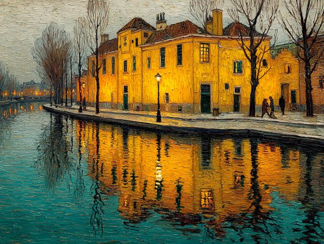 Bathed in a golden glow, the modest yet striking facade of The Yellow House radiates under the wintery Arles sky. Painted by Vincent van Gogh in 1888, this artwork captures the essence of a cold evening with a warm, inviting light spilling from the windows, contrasting sharply with the deep blues and muted reflections in the canal before it. The brushstrokes are vigorous, imbued with emotion and movement that suggest the chill of the air and the stillness of life alongside the water’s edge. Each stroke contributes to an atmosphere that is simultaneously vibrant and serene, a testament to Van Gogh’s unique ability to convey mood through color and texture. This painting not only depicts a scene but also evokes the solitary beauty of urban existence through Van Gogh’s expressive Post-Impressionist style. *** About The Yellow House: Disclaimer: This is a digital reproduction inspired by the original artwork. It is not an official scan or photograph of the original painting.