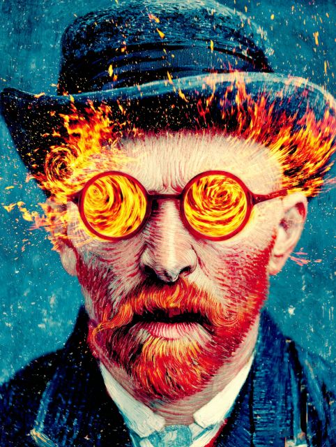 "Flaming Vision: Reimagining Van Gogh’s Portrait with Fiery Goggles" - by Van Gogh