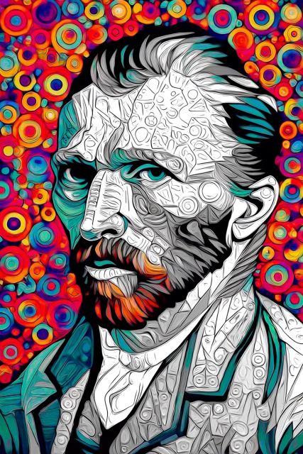 Delve into a captivating portal of swirling hues and striking geometrics that reimagine Vincent van Gogh's inner world. This unprecedented rendition of Van Gogh's self-portrait is composed entirely of star shapes, each filled with a vibrant spectrum that speaks to the painter's famed affinity for the night sky. The artwork's profound emotional depth is palpably woven throughout its intricate textures and vivid contrasts, encapsulating Van Gogh’s turbulent emotions and relentless pursuit of understanding through art. The star shapes not only create a stunning visual mosaic but also reflect Van Gogh's fascination with the cosmos, an element recurrent in his most celebrated works. This piece serves as a modern homage to Van Gogh's enduring legacy and his continued influence on visual and digital art. *** About the "Starry Shapes and Colors: Vincent van Gogh's Imaginative Self-Portrait" ***: Disclaimer: This is a digital reproduction inspired by the original artwork. It is not an official scan or photograph of the original painting.