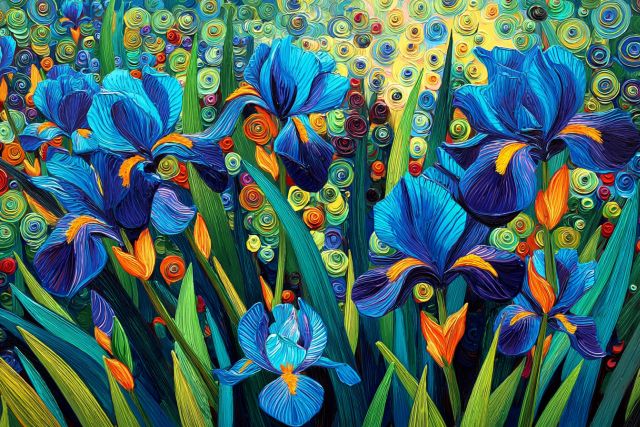 Bathed in a kaleidoscope of vibrant blues and soothing greens, Vincent van Gogh's "Irises" captivates the senses with its dynamic, swirling brushstrokes and vivid depiction of nature’s simple beauty. Painted during his stay at the Saint Paul-de-Mausole asylum in Saint-Rémy, France, this masterpiece showcases van Gogh's unique ability to infuse emotion and movement into the everyday. The luminous blue irises stand tall and proud against a backdrop of golden yellows and mysterious greens, their delicate contours pulsating with life and energy. Van Gogh’s technique of applying thick, expressive strokes lends a tactile quality to the petals, making the blooms almost tangible. Through "Irises," van Gogh explores themes of solitude, hope, and the impermanence of life, inviting viewers into a moment captured in perpetual bloom. *** About the "Irises": Created in the year 1889 during Vincent van Gogh's voluntary stay at the asylum of Saint Paul-de-Mausole in Saint-Rémy-de-Provence, "Irises" reflects a period of intense productivity and profound soul-searching for the artist. Struggling with mental illness, van Gogh found solace and expression in the asylum's garden, which became the inspiration for this work. The painting is characterized by its bold, emotive color palette and dynamic, almost gestural brushwork—a hallmark of van Gogh’s post-impressionistic style. The choice of irises, a flower symbolizing hope and a message being sent, served as a therapeutic focus for van Gogh and expressed emotions he could not convey in words. After completion, "Irises" immediately garnered attention, being one of the few works van Gogh sold during his lifetime. Serving as a poignant reminder of his struggle and brilliance, the painting now resides in the Van Gogh Museum in Amsterdam, continuing to inspire art lovers worldwide with its rich narrative and masterful execution. Disclaimer: This is a digital reproduction inspired by the original artwork. It is not an official scan or photograph of the original painting.