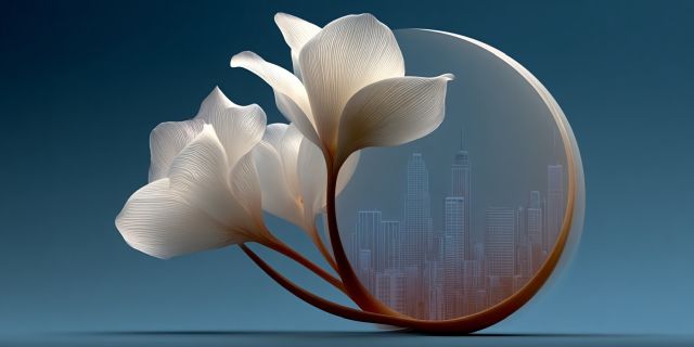 In this extraordinary artistic rendering, two pristine white flowers burst into bloom against a remarkably detailed city skyline backdrop. The artwork marries the delicate beauty of nature with the stark, often imposing, forms of an urban landscape. Encapsulated within a circular frame, this depiction plays with concepts of containment and openness, crafting a visual poetry that is both thought-provoking and deeply striking. The gentle curvature of the flower petals contrasts boldly with the vertical aspirations of the skyscrapers, inviting viewers to explore themes of natural vs. manmade, growth vs. construction, and isolation vs. community. The city, subtly imbued in shades of blues and grays, stands as a testament to human achievement, while the flowers' translucent petals suggest a softness and impermanence that challenge the city's permanence. Through this artwork, one experiences a tranquil coexistence, infusing any viewer with a sense of peace coupled with ambitious desire, perfectly suited for reflective or inspired moments.