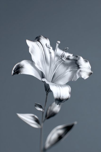 Enthralling viewers with its delicate charm, this stunning monochrome portrayal of a lily invites a pause, a breath taken amidst the rush of daily life. The graceful curves and folds of the petals, rendered in shades of silver and gray, dance subtly under the caress of ambient light, creating a visual rhythm that is at once calming and captivating. The purity and simplicity of the composition enhance the natural elegance of the flower, transforming it into a symbol of serenity and timeless beauty. This artwork serves not only as a decoration but as a focal point of contemplation, a reminder of nature's effortless artistry even when stripped of vibrant colors. The fine details, visible in the anthers and the texture of the petals, showcase the artist’s meticulous attention to capturing the essence of floral splendor. The choice of a monochromatic palette elevates the subject, granting it a universal appeal that transcends the boundaries of traditional floral art. Every glance brings a new appreciation of this intricate exposure, highlighting the intricate balance between light and shadow, form and void. This piece is ideal for those who cherish the subtle interplay of light and appreciate a sophisticated, minimalist approach to natural subjects.