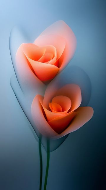 Envelop your senses in a world of subtle grace with this enchanting portrayal of dual roses, each tenderly unfurling in a symphony of pastel orange and pink. The artistry behind the capture lies in the delicate interplay of light and shadow, which sculpts the petals into soft swirls that resemble the tender embrace of morning. As the background fades into a tranquil shade of cool blue, it casts a serene and nearly ethereal glow over the flowers, enhancing their vibrant yet soft hues. This image skillfully combines elements of nature and artistic expression, creating a timeless piece that evokes feelings of peace and calmness. Each petal appears as though it has been painted with meticulous strokes of an artist's brush, boasting textures that invite touch and contemplation. Ideal for those who appreciate the understated beauty of floral artwork, this piece serves not only as a visual treat but also as a source of daily inspiration and tranquility.