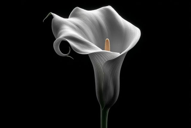 Amidst the vast world of floral photography, a monochrome masterpiece emerges, capturing the allure of a single calla lily with unmatched grace. This exquisite image weaves a tale of simplicity and sophistication through its stark contrast and delicate curves. The calla lily, a symbol of purity and beauty, stands proudly against a pitch-black backdrop, its silhouette sculpted by the gentle play of light and shadow. The smooth, flowing lines of the flower's spathe draw the viewer's eye, guiding them along a journey of visual serenity and natural splendor. This artwork, with its detailed textures and subtle highlights, invites contemplation and introspection, making it a perfect statement piece for any space that values beauty in its most refined form. The photographer’s skill is evident in the careful balance of light, ensuring that each ripple and crease of the lily is preserved and pronounced. This image not only celebrates the inherent beauty of the calla lily but also showcases the power of photography in capturing the ephemeral magic of the natural world. It’s a testament to how art can freeze time and beauty, allowing us to gaze upon it as if the flower will never wilt, forever encapsulated in its moment of perfect bloom.